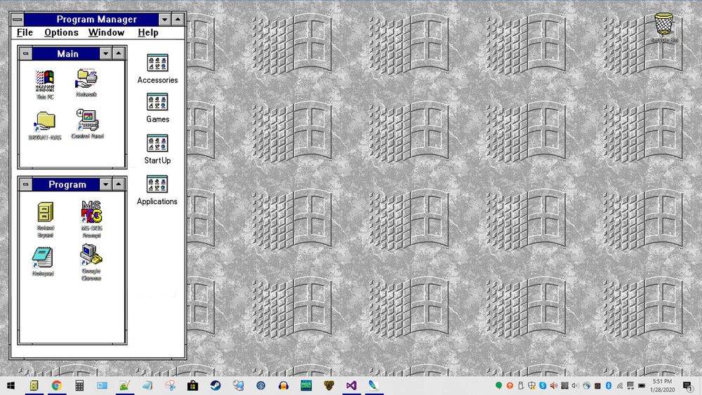 It was like a throwback to an earlier time. Unfortunately the Windows 8 start screen had nothing on Program Manager, For those feeling Nostalgic for windows 3.1, I’ve made these desktop wallpapers. They’re 1920x1080 and will work for any resolution below that with the same ratio. You can find the original Photoshop file here, if you want to add your own backgrounds underneath the program manager.